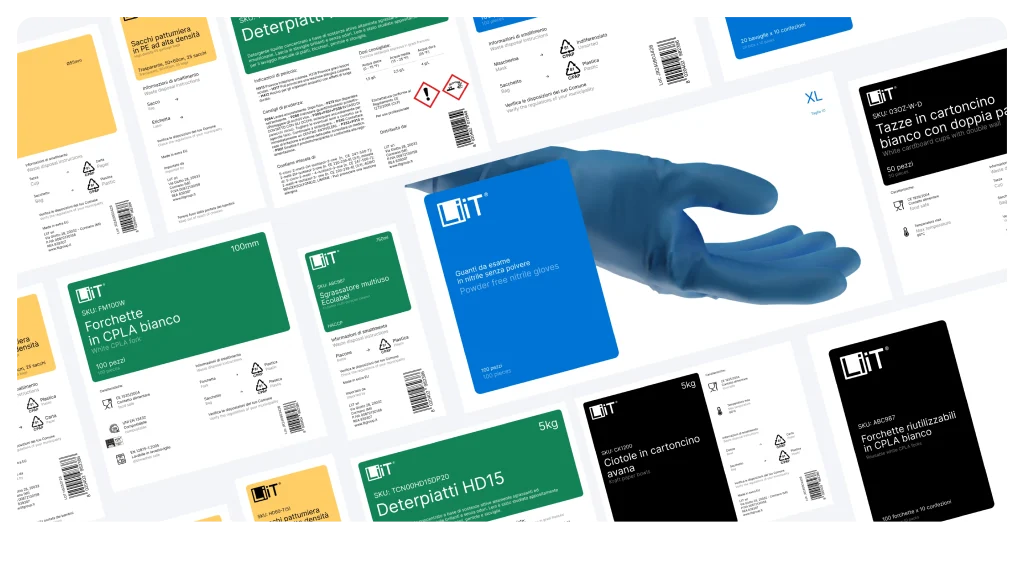 LiiT importa e distribuisce articoli monouso per il settore HoReCa. Il cliente principale dell’azienda sono rivenditori per cui l’anonimato del fornitore è un asset strategico. Nel sistema di packaging che ho sviluppato, il quadrato, posto sempre in alto a sinistra, si sostituisce al logo aziendale. Questo elemento distintivo garantisce che, anche quando il logo sarà rimosso definitivamente, il brand rimarrà riconoscibile pur mantenendo l’anonimato.