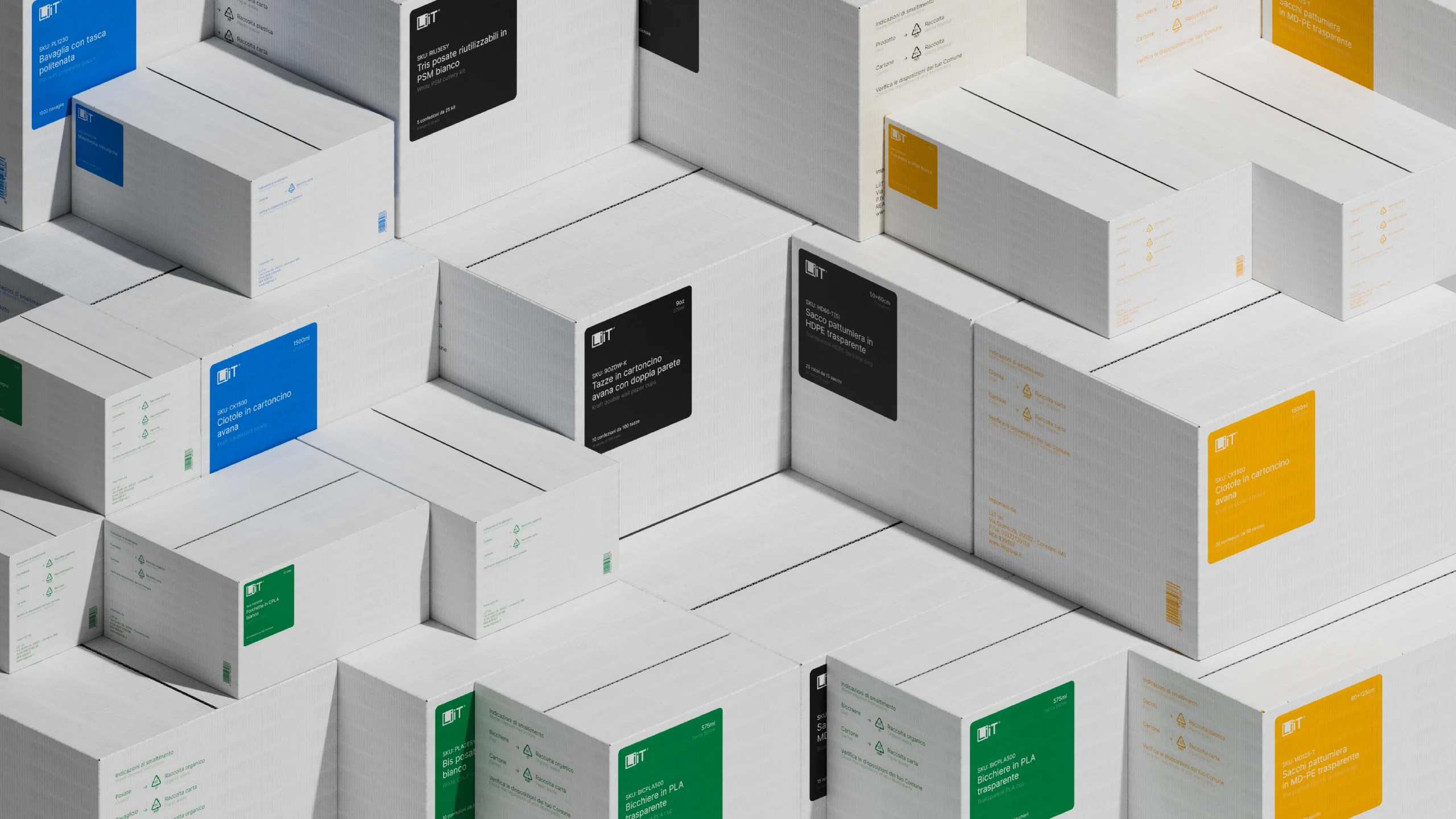 LiiT importa e distribuisce articoli monouso per il settore HoReCa. Il cliente principale dell’azienda sono rivenditori per cui l’anonimato del fornitore è un asset strategico. Nel sistema di packaging che ho sviluppato, il quadrato, posto sempre in alto a sinistra, si sostituisce al logo aziendale. Questo elemento distintivo garantisce che, anche quando il logo sarà rimosso definitivamente, il brand rimarrà riconoscibile pur mantenendo l’anonimato.